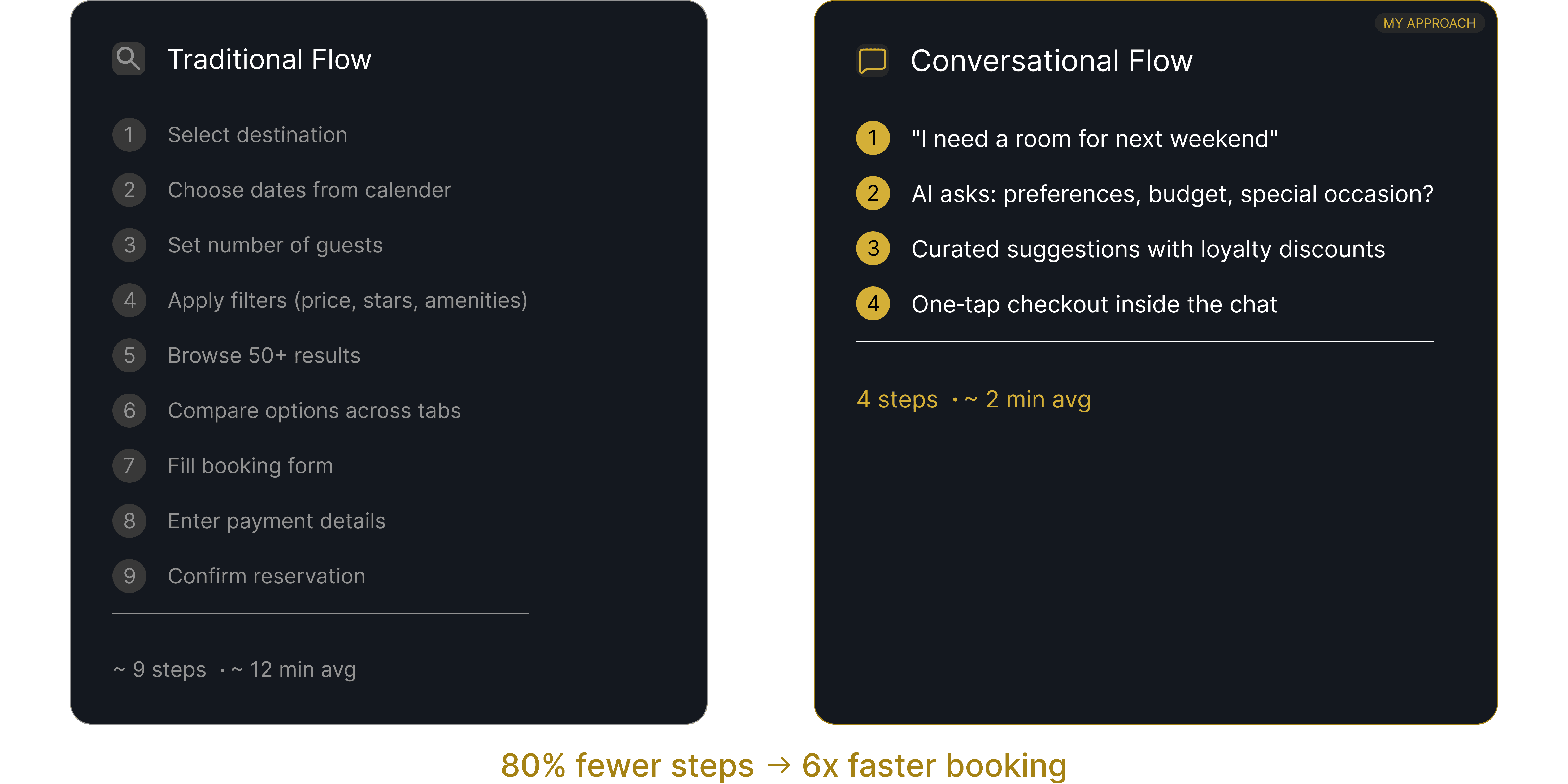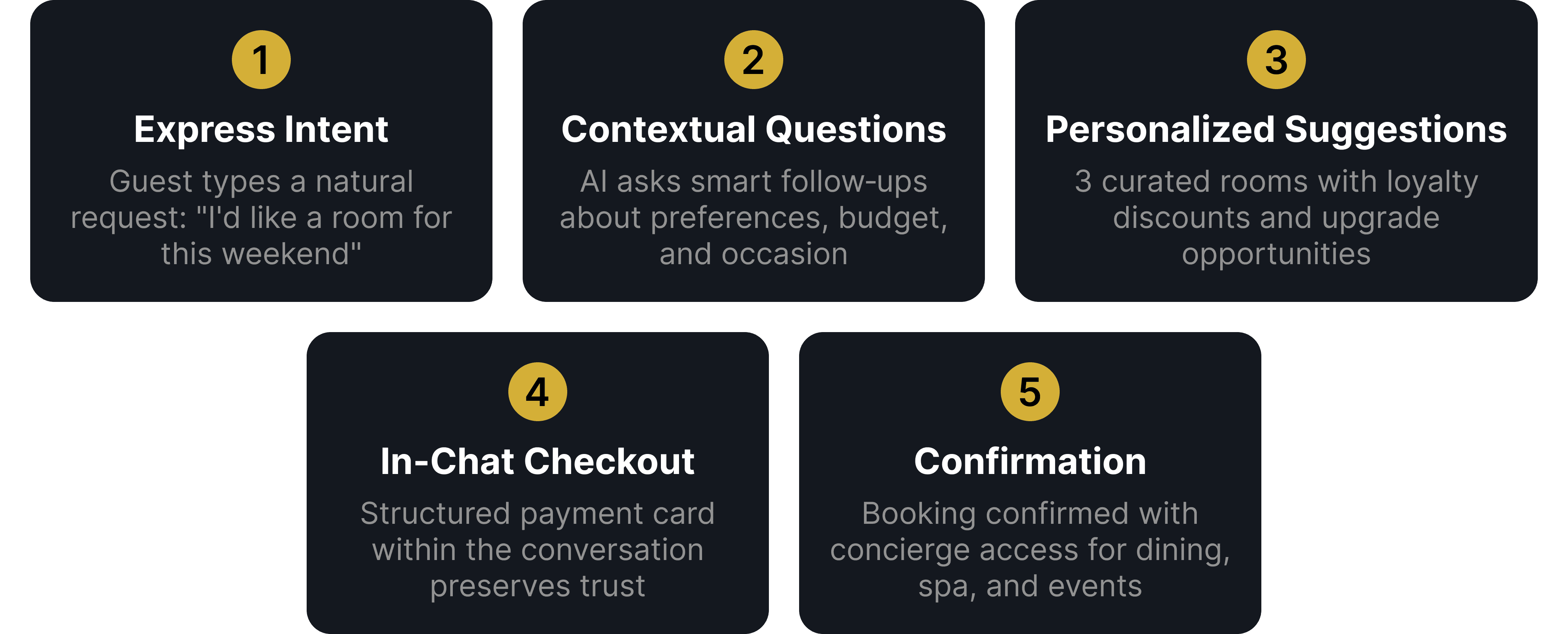 Users express goals, "book a room for my anniversary," "find dinner near the hotel," "what events are on tonight?" They don't think in categories, date pickers, and dropdown menus. The gap between intent and interface is where friction lives.