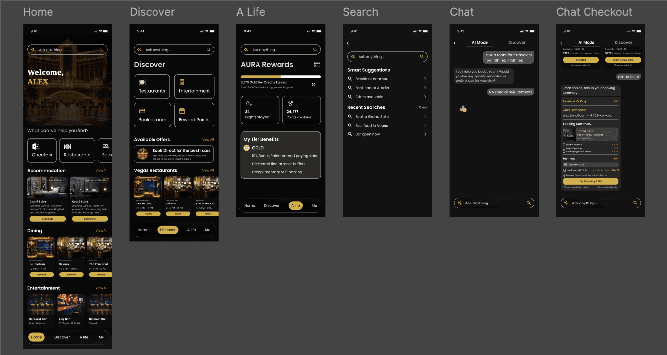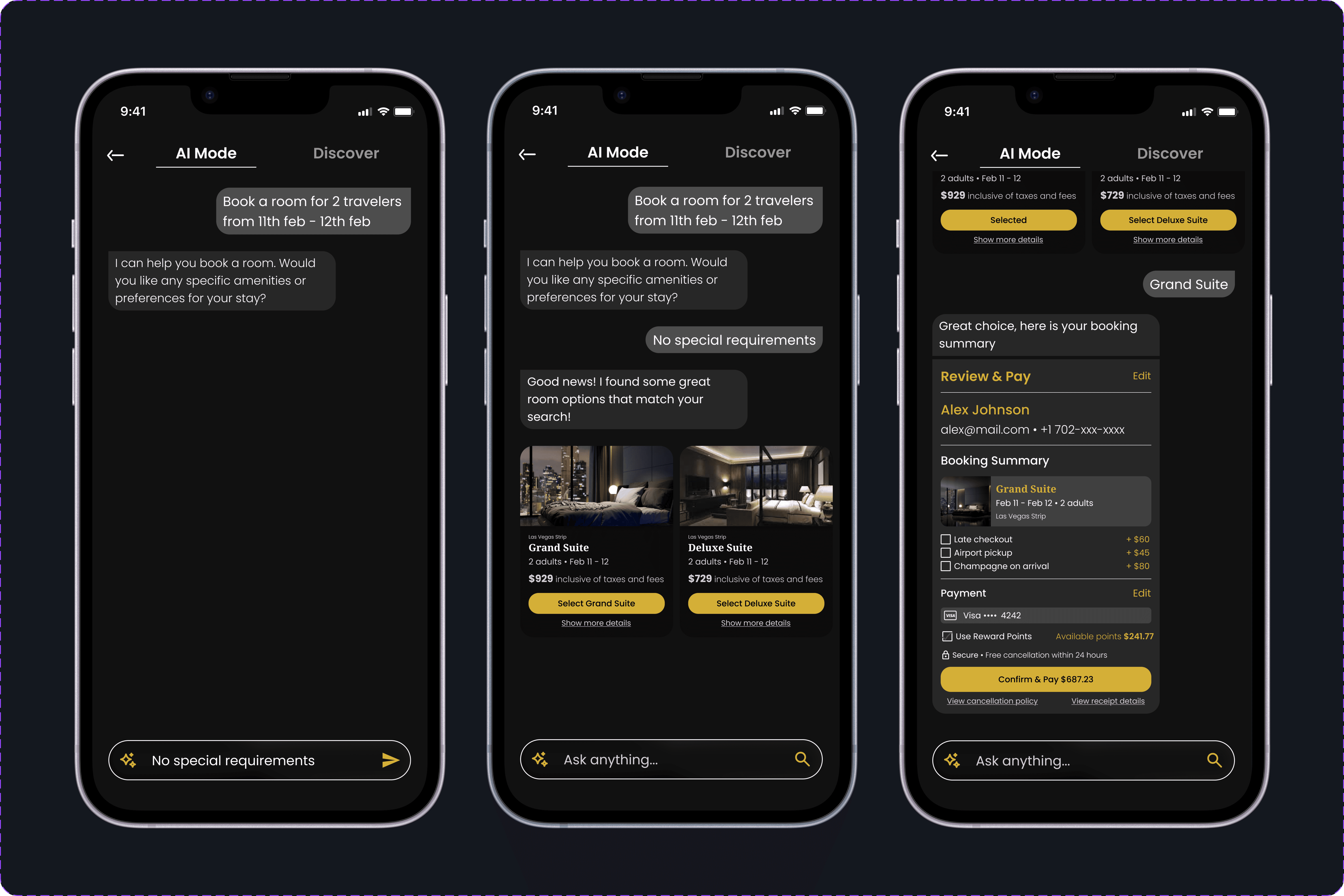 The solution is an AI-first, all-in-one hospitality platform that enables guests to book rooms, discover dining, explore events, and manage rewards through a conversational interface. By integrating structured checkout directly within chat and unifying services into one ecosystem, the design reduces friction, shortens time to booking, increases cross-sell opportunities, and improves overall engagement.