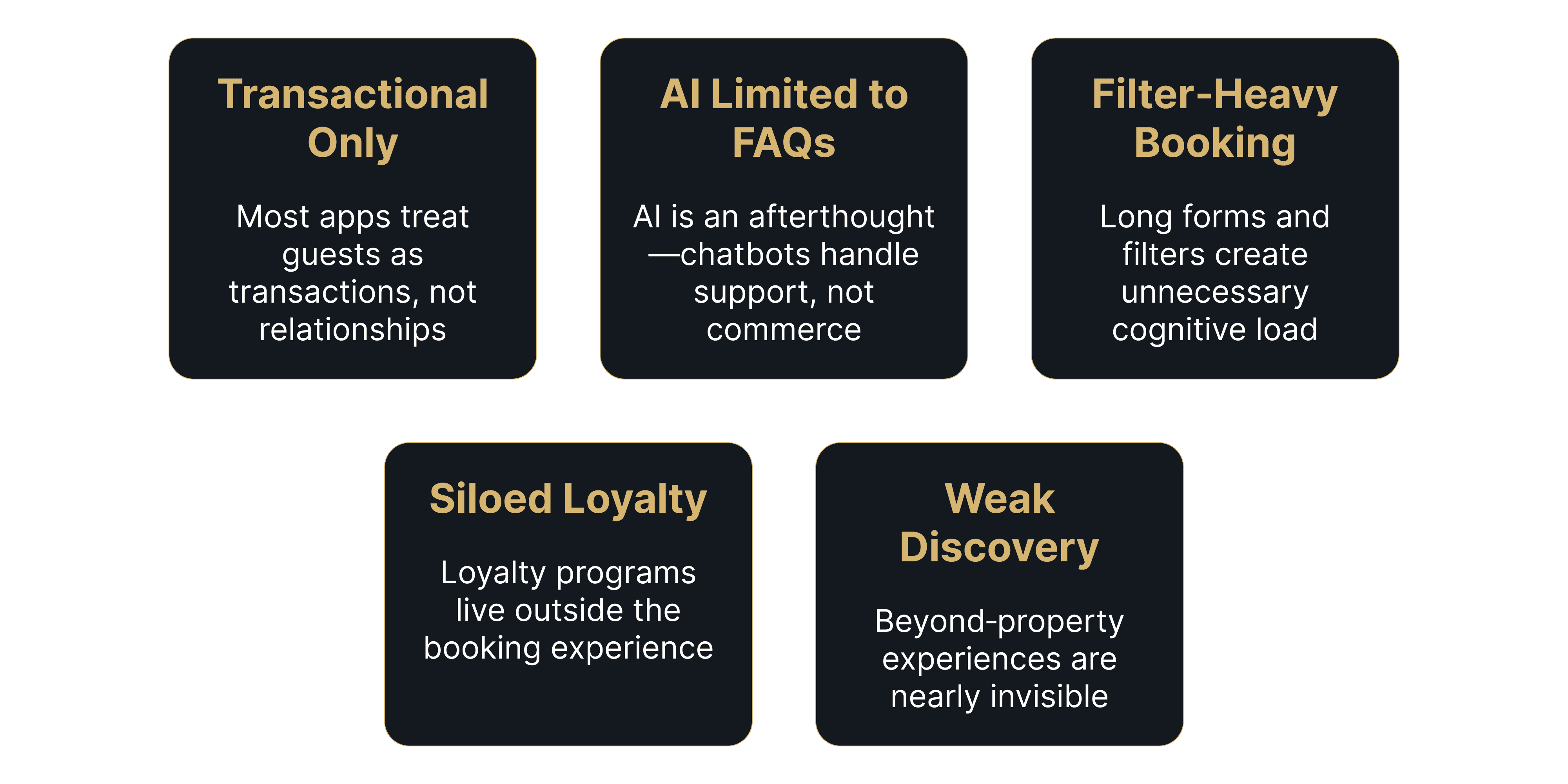 I audited leading hospitality apps and mapped user behavioral patterns. The result: fragmented ecosystems, transactional interfaces, and AI that barely scratches the surface.