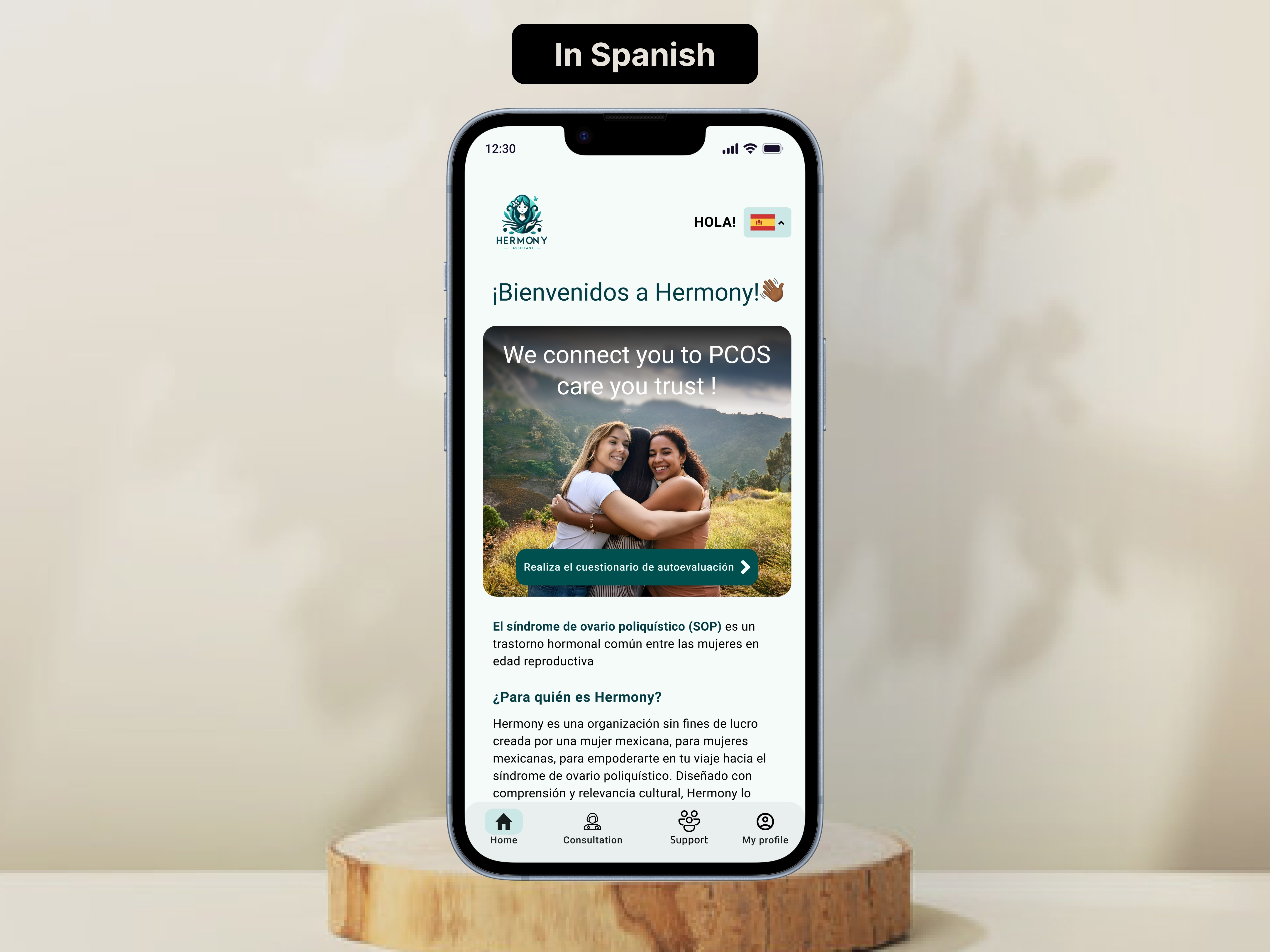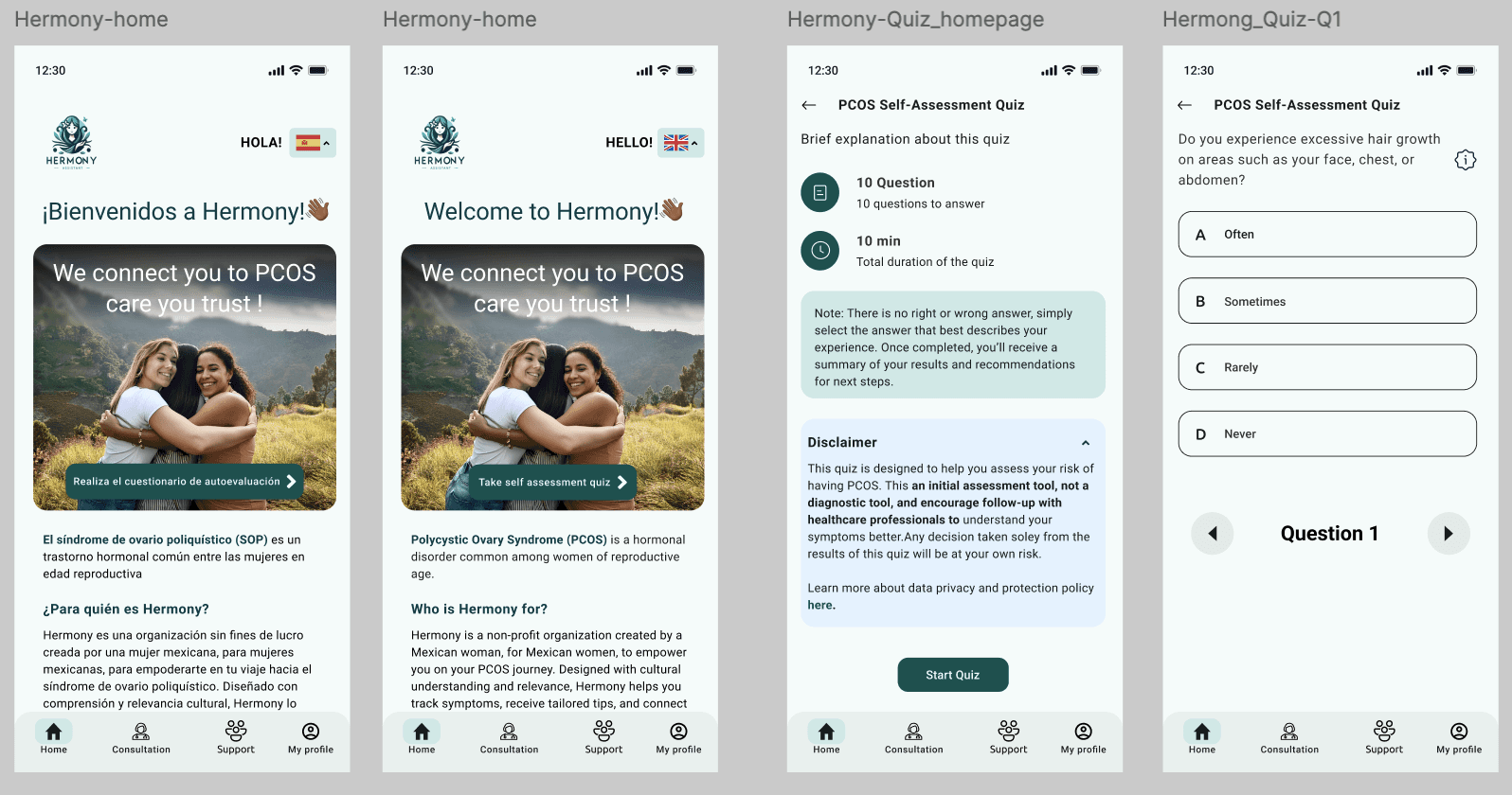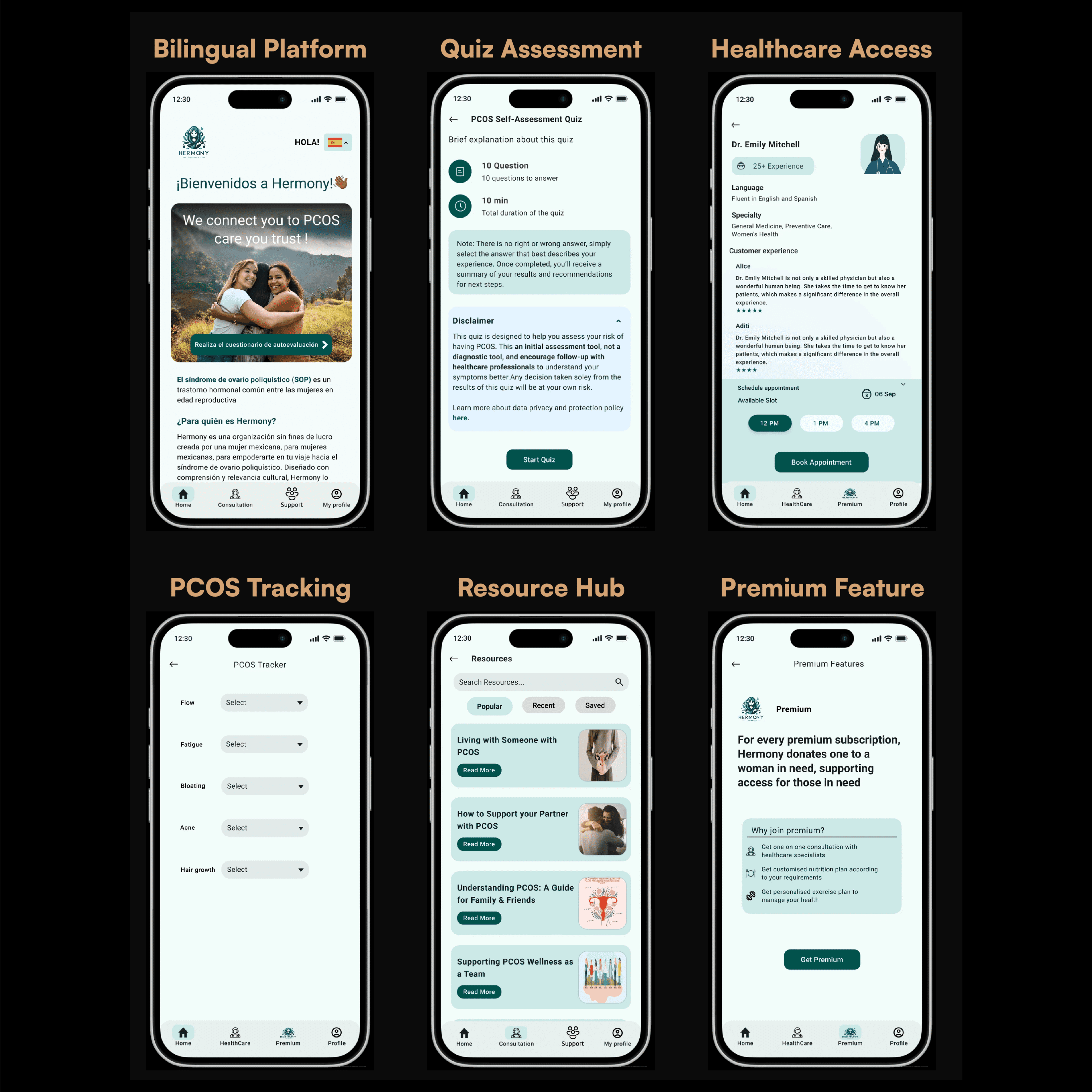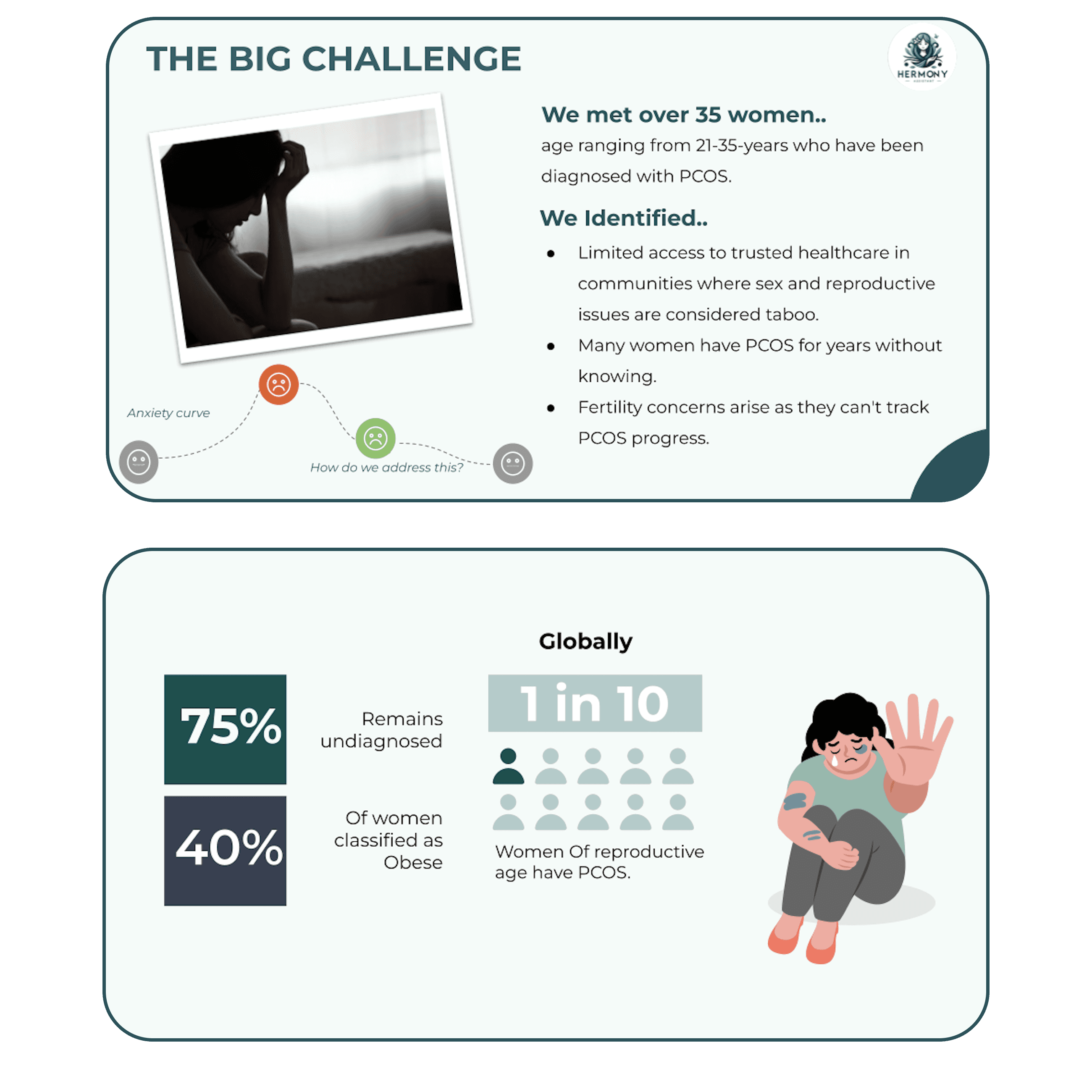 Hermony, a user-centric PCOS management platform for Mexican women aged 15–45, addressing challenges like delayed diagnosis, limited support, and ineffective tracking. The experience was shaped through user interviews and close collaboration with healthcare professionals, resulting in a freemium solution with personalized tracking, male engagement tools, and community support features.