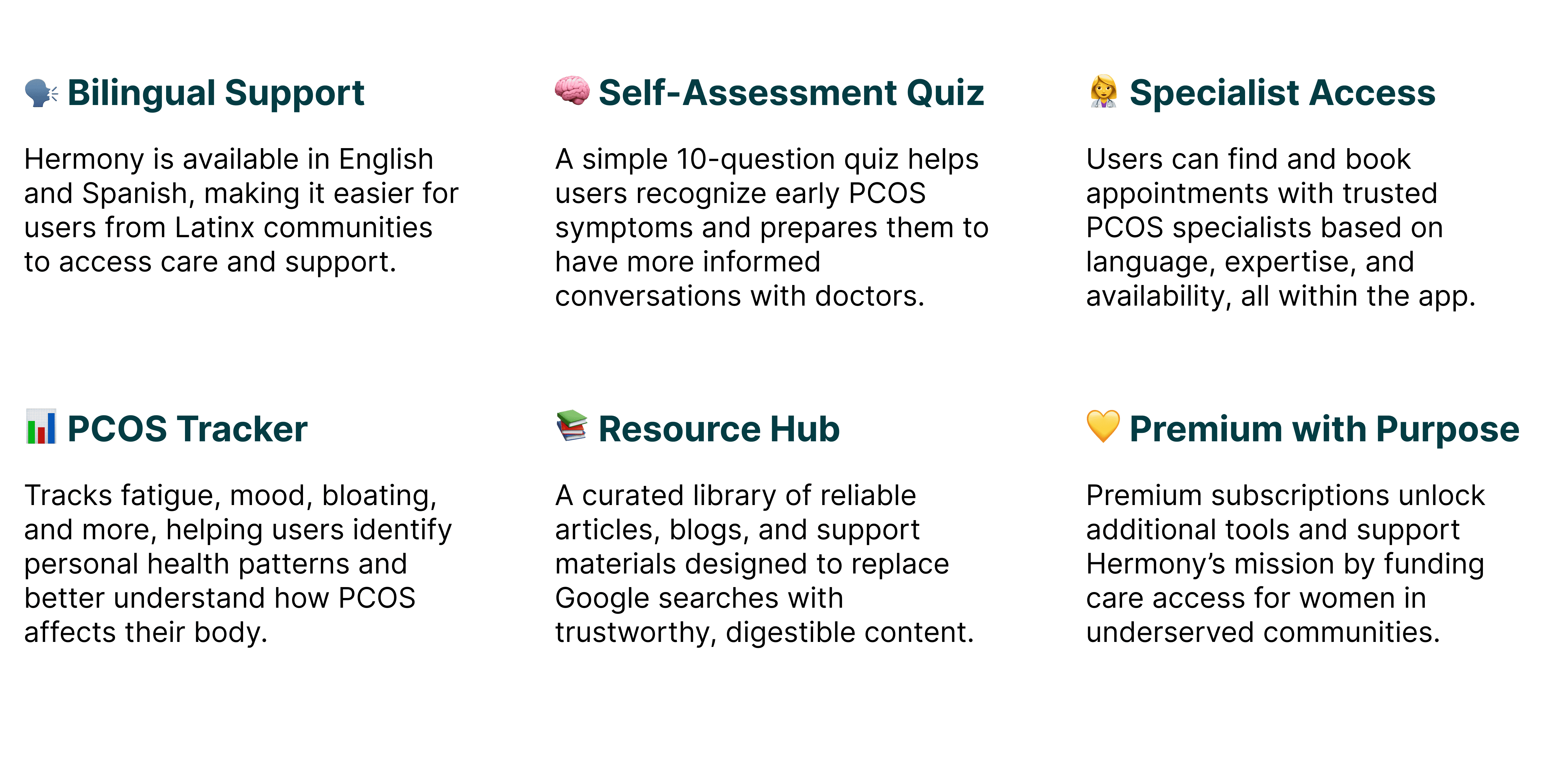 From the research and interviews we conducted, we identified key pain points and user needs, which guided the development of the following core features to create a seamless and empowering experience for women managing PCOS. Every feature in Hermony was designed with one goal: to make women feel seen, supported, and in control of their PCOS journey. Through dozens of interviews, we heard stories of misdiagnoses, medical gaslighting, and overwhelming confusion. Hermony is our response, a tool built with empathy and real-life needs in mind.